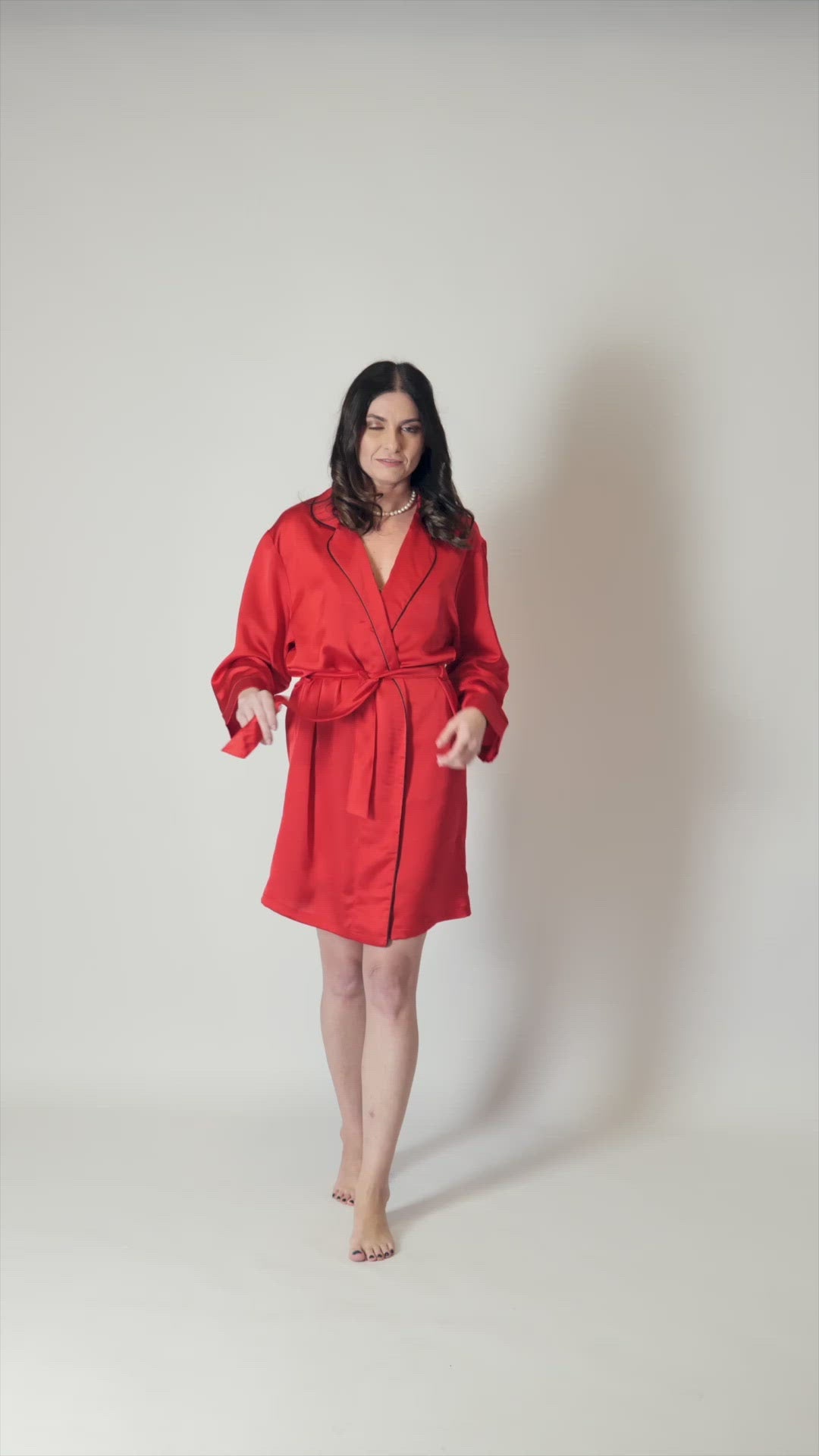 Set confecționat din mătase, compus din halat și pijama cu top și pantalon scurt, ideale pentru a fi purtate în confortul casei tale.